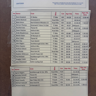 Followed by rider 5 (Paul Burrows, Thanet RC) at 56:28 (age adjusted). Notably just 30 seconds separated the age adjusted times of 5 (Paul Burrows, Thanet RC), 1 (Gary Grayland, CC Bexley), 11 (John Rogers Southborough & District Whs) and 15 (Stephen Wilkinson, Vanelli Project GO). With just 1 second separating rider 1 and 11.